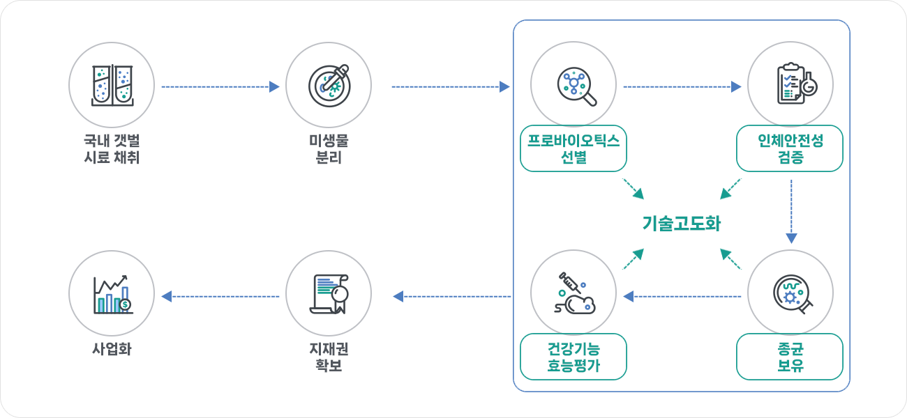 다양한 해양 환경에서 존재하는 미생물을 분리 및 동정하여 신규 균주를 발굴하고 자원화하여 이를 사업화 하는데 앞장서고 있다.이렇게 분리된 균주는 건강기능식품 및 신약의 원료로 이용되며 타 원료와의 배합을 통한 신원료 발굴 및 연구에 이용되어집니다.